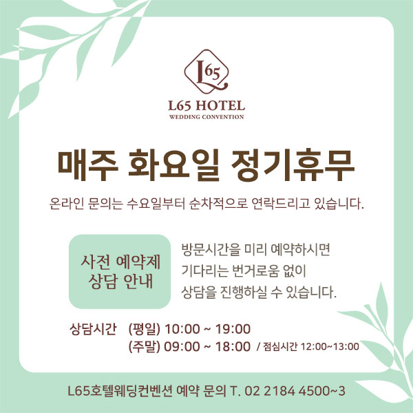 2027년 하반기 웨딩 예약 OPEN 2027년 하반기 웨딩 예약 시작합니다. 서둘러 예약하시고 할인 혜택 받으세요~ 기간 2026/03/21 ~ 계속 내용 보기 본식원판, 본식스냅 & 본식영상 스페셜 프로모션 하이퀄러티 본식원판, 본식스냅 및 영상을 특별 할인된 가격으로 만나 보세요. 기간 2026/01/05 ~ 계속 대상 신규 계약자 및 2026년~2027년 기존 모든 계약자에 혜택 적용 내용 보기 2025 송년모임 예약 받습니다. 소중한 분들과 함께 한해의 마무리와 새로운 시작을 L65호텔웨딩컨벤션과 함께하세요. 기간 2025/09/25 ~ 계속 내용 보기 매주 화요일 정기 휴무 휴무일을 확인하시어 방문에 착오없으시길 바랍니다. 기간 2024/06/12 ~ 계속 내용 보기 1